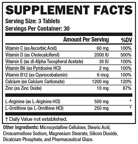 Ingredients: Vitamin D3 as cholecalciferol Vitamin B12 Dl-alpha tocopheryl acetate Pyridoxine Calcium Carbonate Zinc L-arginine L-ornithine.