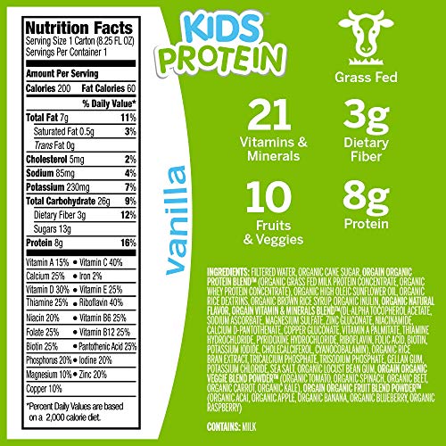 Orgain Organic Healthy Kids Chocolate Nutritional Shake, 8.25 Fluid Ounce — 12 per case. 10 different organic fruits and veggies Organic complex carbohydrates from brown rice 23 vitamins and minerals 8 grams of organic protein Doctor developed Gluten free